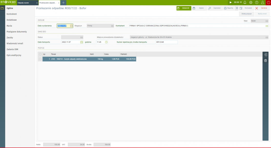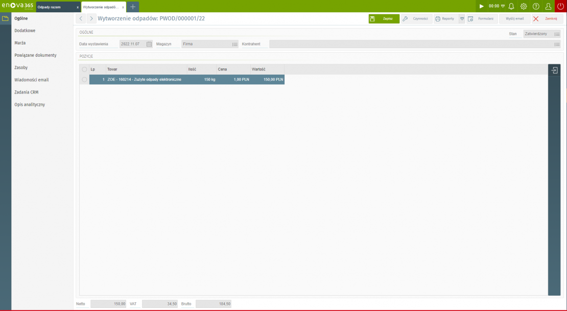 Potwierdzenie wytworzenia odpadów w enova365