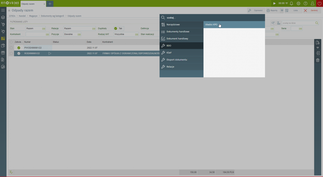 Na podstawie przygotowanego dokumentu przekazania odpadu, w systemie enova365 wygeneruj KPO, czyli Kartę Przekazania Odpadu.