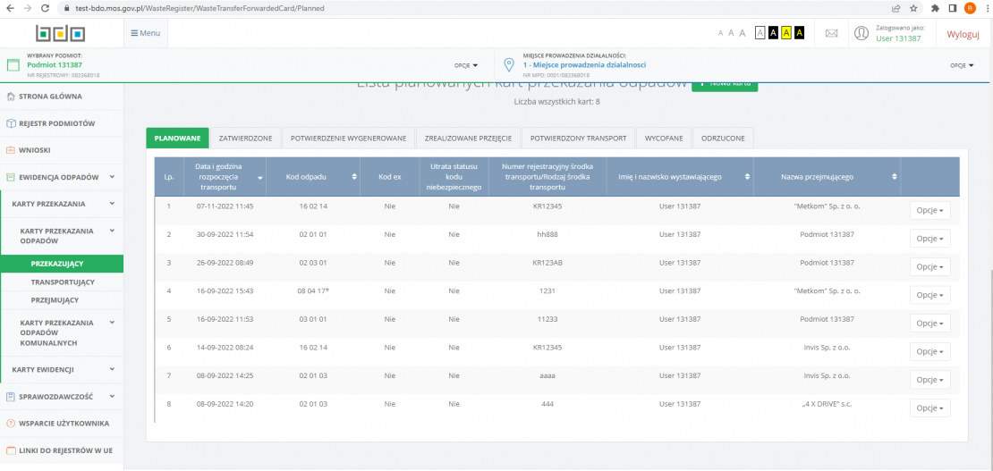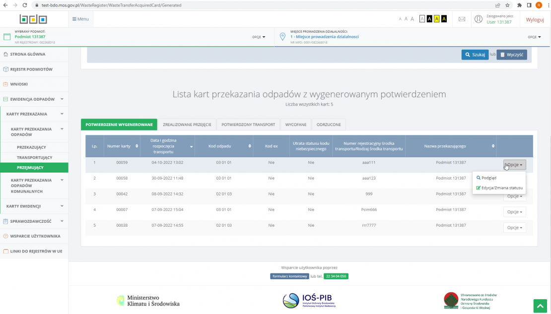 Utworzone KPO jest widoczne w systemie BDO Ministerstwa Środowiska i Klimatu. Po wygenerowaniu Karty w systemie enova365 pojawia się status „zatwierdzona”, co oznacza, że Karta została poprawnie wysłana.