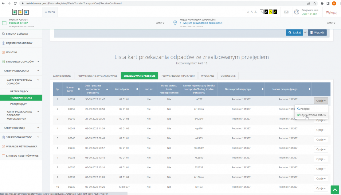 1. Aktualizacja statusu dla przekazującego odpady z systemu BDO