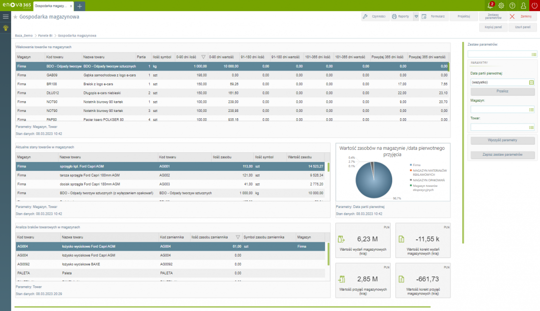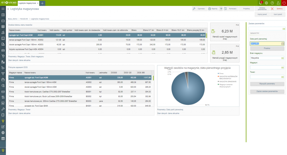 enova365 to system ERP, który gromadzi i porządkuje informacje z wszystkich obszarów działalności przedsiębiorstwa. Moduł Handel i magazyn, który jest częścią tego systemu, umożliwia optymalizację zarządzania magazynem, między innymi, poprzez generowanie dokumentów, porządkujących przesunięcia międzymagazynowe oraz wydania i przyjęcia magazynowe, a także list stanów magazynowych. Z kolei moduł Business Intelligence enova365 wykorzystuje znajdujące się w systemie ERP dane magazynowe i tworzy na ich podstawie wizualizacje w formie praktycznych tabel, wykresów czy wskaźników. To tak zwane Panele BI. Analizowanie zawartych w nich danych i podejmowanie na ich podstawie decyzji pomoże Ci zrealizować cel, jakim jest optymalizacja procesów magazynowych.