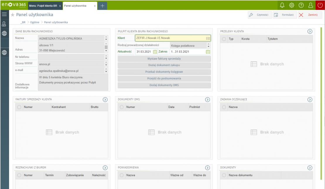 Ponieważ wszystkie informacje, których może potrzebować klient są w systemie nie musi on się kontaktować mailowo czy telefonicznie z księgowymi, co oszczędza czas zarówno księgowych, jak i klientów. Kontakt klientów z biurem odbywa się głównie poprzez platformę. Dotyczy to także anglojęzycznych klientów firm księgowych, bo Pulpit Klienta enova365 obsługiwany jest także w języku angielskim.
