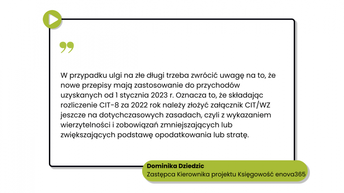 - Zmiany w zakresie tzw. ulgi na złe długi – Od 1 stycznia 2023 r. podatnicy dokonujący zwiększeń lub zmniejszeń, wynikających z ulgi na złe długi, nie będą już zobowiązani do wykazywania w zeznaniu podatkowym wierzytelności lub zobowiązania, z którymi związane są te zwiększenia lub zmniejszenia.
