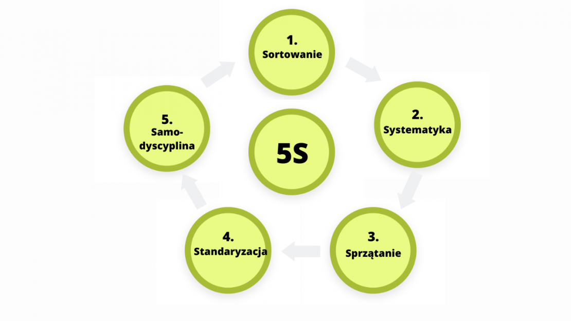 - 5S (6S) – metoda zarządzania szeroko pojętą standaryzacją pracy, polega na podzieleniu jej na fazy: sortowania (porządkowanie stanowiska pracy), systematyki (np. oznaczanie miejsc niezbędnych do jej wykonywania), sprzątania (czyszczenie miejsca pracy, ale i szukanie oraz rozwiązywanie problemów z nim związanych), standaryzacji (ujednolicenia procesów zachodzących na identycznych stanowiskach pracy), samodyscypliny (podporządkowania się zasadom w celu poprawy wydajności). Narzędzie 6S wszystko spina jeszcze warunkiem bezpieczeństwa (safety) pracy na każdym z etapów i stanowisk;