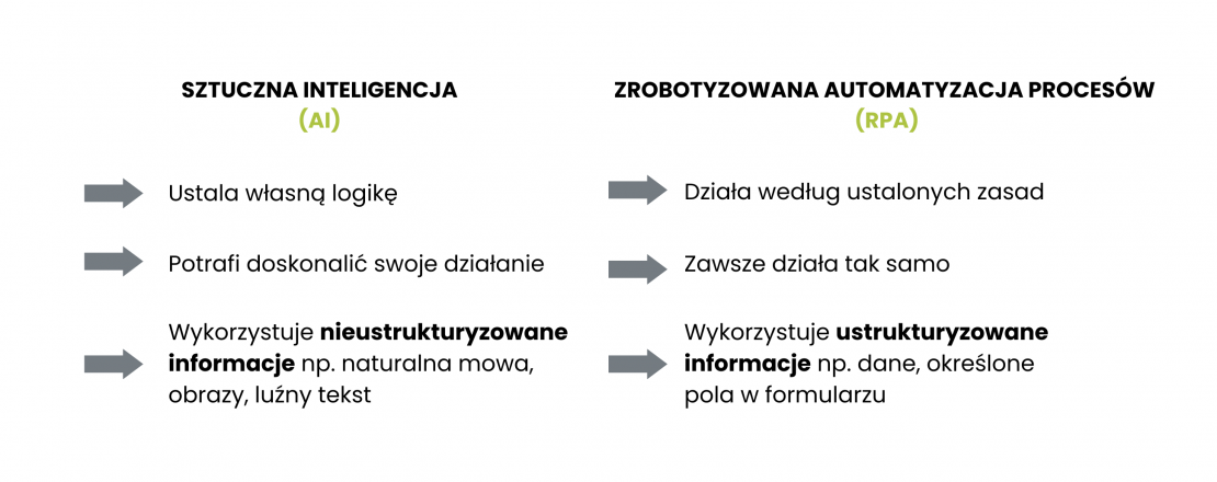 Z powyższych definicji wynika więc jasno, że podczas gdy RPA jest wykorzystywana do automatyzacji wybranych czynności i procesów pod nadzorem człowieka, AI jest postrzegana jako technologia, która może zastąpić ludzką pracę i pracować bez jej nadzoru. Co więcej, podczas gdy RPA do działania potrzebuje ustrukturyzowanych informacji, AI przetwarza także te nieustrukturyzowane. W wielu procesach firmowych zaangażowane są zarówno ustrukturyzowane, jak i nieustrukturyzowane dane, dlatego ich pełna automatyzacja wymaga zarówno technologii AI, jak i RPA.