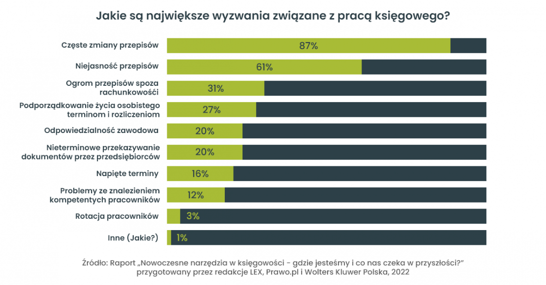 Jako właściciel biura rachunkowego prawdopodobnie wiesz, że branża usługowej obsługi księgowej firm przechodzi obecnie dużą zmianę, która jest podyktowana koniecznością stawienia czoła nowym problemom. Te najważniejsze podsumował raport „Nowoczesne narzędzia w księgowości – gdzie jesteśmy i co nas czeka w przyszłości?” przygotowany przez redakcje LEX, Prawo.pl  i Wolters Kluwer Polska. Tradycyjnie, największym wyzwaniem w pracy księgowych są częste zmiany w przepisach – taki problem wskazało aż 87% badanych księgowych. Inne problemy biur rachunkowych to, między innymi, odpowiedzialność zawodowa i związane z nią kary oraz problemy ze znalezieniem kompetentnych pracowników i ich rotacja.