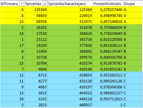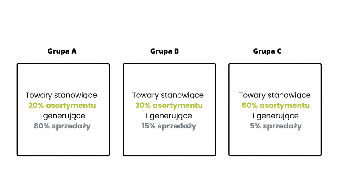 Przykład grup towarów, wyznaczonych na podstawie skumulowanego procenta wartości. Grupa A – towary, dla których skumulowany procent udziału jest mniejszy lub równy 0,70; Grupa B – towary, dla których skumulowany procent udziału jest większy niż 0,70 i mniejszy lub równy 0,95; Grupa C – towary, dla których skumulowany procent udziału jest większy niż 0,95.