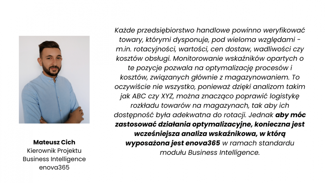 W prowadzeniu tego typu procesów pomóc Ci może dostosowany do Twojego biznesu system ERP. W tym wypadku sprawdzą się najlepiej moduły Handel i magazyn w enova365. Aby przekonać się, jakie zastosowanie może mieć ten system w Twojej firmie, zamów bezpłatne demo lub umów się na bezpłatną konsultację. W tworzeniu dedykowanych raportów pomóc ci może także moduł  Business Intelligence