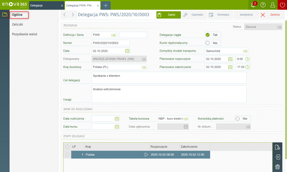 W przypadku systemu enova365 rozliczanie delegacji następuje w kilku etapach. Pierwszym z nich jest wprowadzenie wyjazdu, czyli uzupełnienie wszystkich danych z nim związanych, m.in.: