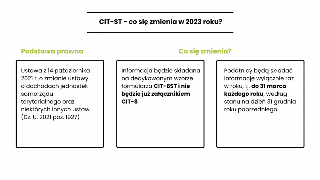 Nowe przepisy uprościły ten obowiązek. Od 1 stycznia 2023 r. informacja będzie składana na dedykowanym wzorze formularza CIT-8ST i nie będzie już załącznikiem CIT-8.