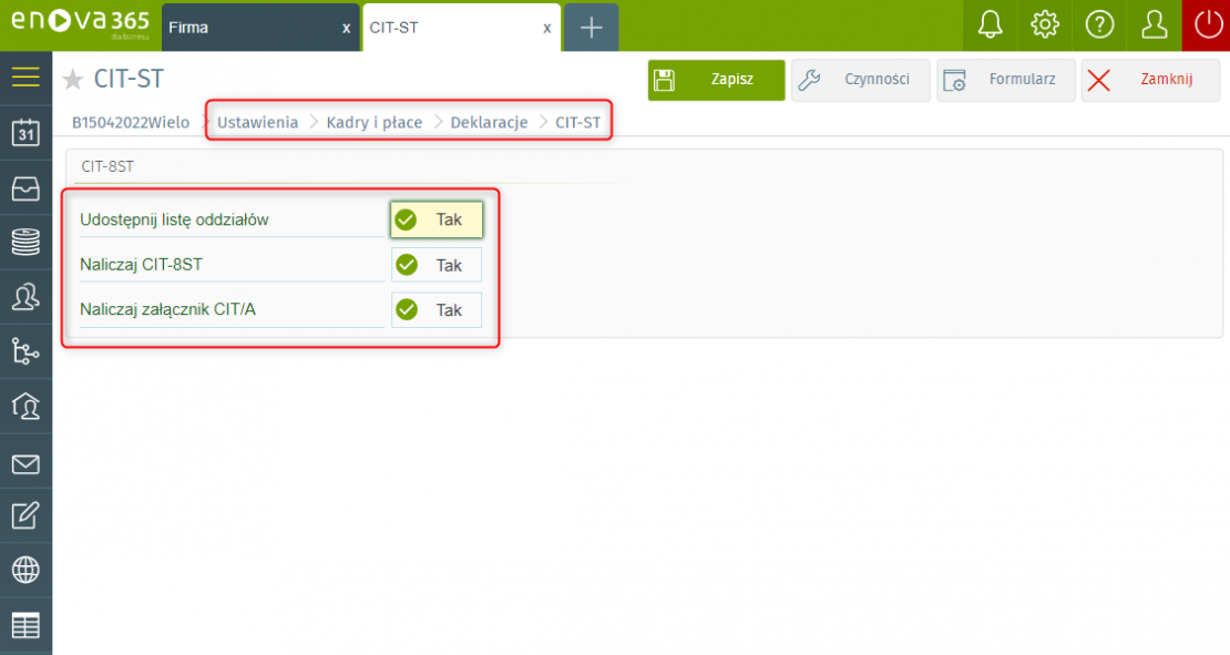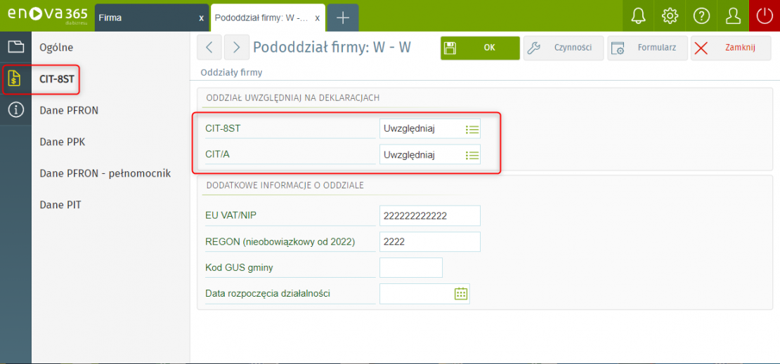 Zmiany w zakresie CIT-8ST, czyli nowy formularz deklaracji CIT-8ST(1) wraz z załącznikiem CIT/A(1), mechanizmy do przygotowania i wysyłki eDeklaracji oraz wydruk pomocniczy „Informacja CIT-8ST(1)” zostały udostępnione Klientom enova365, którzy korzystają z modułu Księgowość w wersji 2212.0.0 w ramach standardowej aktualizacji systemu. Dzięki temu, korzystając z system ERP enova365 bez problemu wypełnisz obowiązki nałożone przez prawo na płatników podatku CIT.