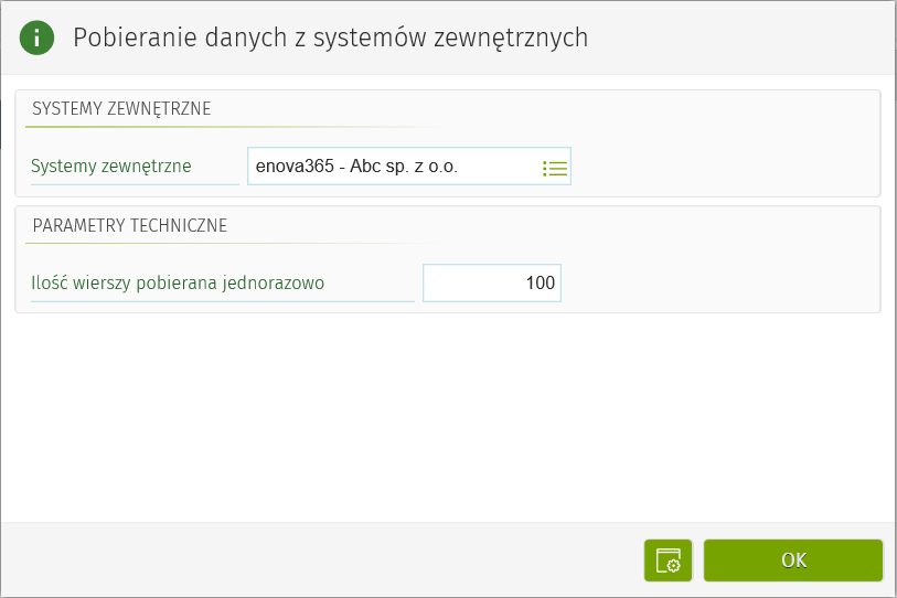 Z poziomu użytkownika systemu to czynność w menu głównym, służąca do pobierania danych ze wskazanych w oknie parametrów instalacji zewnętrznych. Skutkuje ona pobraniem danych z systemu odległego i zapisaniem ich w bazie lokalnej.